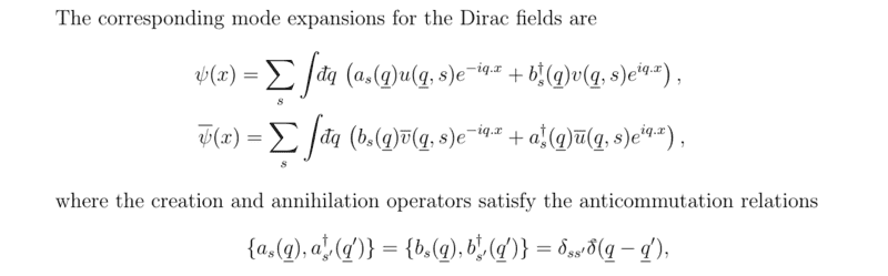 - $$\psi(x) = \sum_s \int d\tilde{q} \left(a_s(q) u(q,s) e^{-iq \cdot x}+ b_s^\dagger(q) v(q,s) e^{iq \cdot x}\right)$$