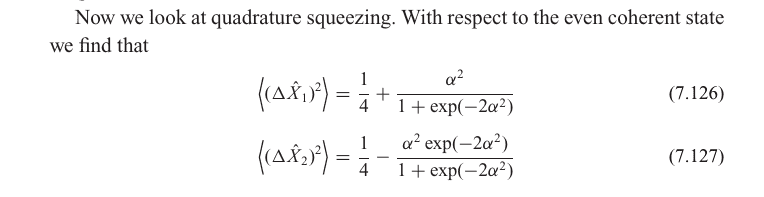 - I need to derive the equations 7.126 and 7.127(image posted) from Gerry/Knight's quantum optics book. The equations are the expectation values of the square of the quadrature operators for the even cat state.