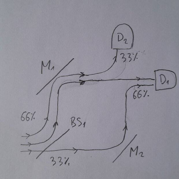 In the Bohm interpretation, the 52% of photons reflected at BS1, traveling with a stronger quantum potential, should reflect off M1, enter region I2, 'bounce off' the weaker quantum potential arriving from the lower path, then head towards D2 at an angle bent slightly towards D1. The 48% of photons transmitted at BS1, traveling with a weaker quantum potential, should reflect off M2, enter region I2, 'bounce off' the stronger quantum potential arriving from the upper path, then head towards D1 at an angle bent slightly towards M2.