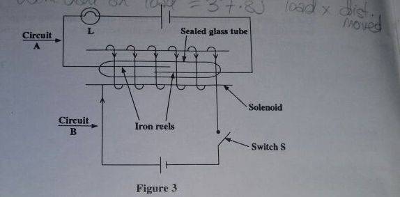 As the current passes through to the solenoid from circuit B, the magnetic field that is formed within the solenoid causes the two iron reels to attract to one another, thus allowing the current to flow and light the Lamp L.