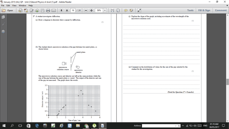 The question asked for an explanation of the shape of the graph, but the link to detector output, the value of the y-axis, was often missed entirely. Others described the shape of the graph in great detail, point by point in some cases, but did not mention diffraction at all despite the introduction of the phenomenon in part (a). A surprising number did not even make a clear statement of their estimate of the wavelength. In terms of marks, most scored at least 1, but more than 3 were rarely awarded. The most common marks were for a statement of a reasonable wavelength and for linking maximum output to ‘maximum diffraction’ when the gap size equals the wavelength. The value of zero output for zero gap size was usually ignored. There is little understanding of the situation when the gap size is less than the wavelength and that the angle through which the wave is diffracted remains a maximum while the intensity decreases as the gap gets smaller than the wavelength. When discussing the distribution of values a mark was sometimes awarded for suggesting that it is uneven, but little else of merit was ever seen.