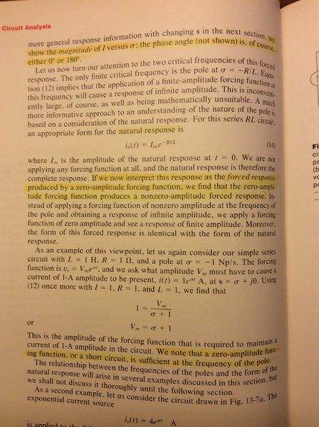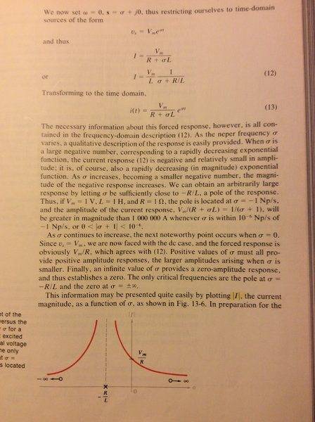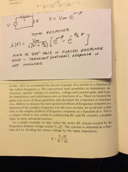 However, apply an exponential forcing function of Vm e^sigma t. t = time. Assuming we allow the transient to decay and then just look at the forced function we have: i(t) = (Vm/(R + sigma L) ) x e^sigma t.