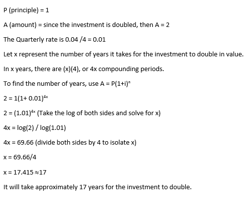 - Participants share their attempted solutions and seek verification of their methods. There is mention of the "rule of 72" as a conceptual tool for estimating the time required for an investment to double, prompting further exploration of its relevance to the problem.