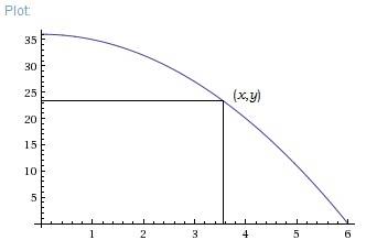 A rectangle has on corner on the graph of y=36-x^2, another at the origin, a 3rd on the positive y-axis, and the fourth on the positive x-axis. Express the area A of the rectangle as a function of x. What is the domain of A? For what value of x is A largest?