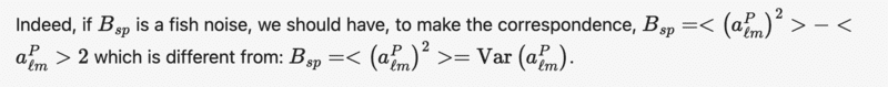 Indeed, if ##B_{s p}## is a fish noise, we should have, to make the correspondence, ##B_{s p}=<\left(a_{\ell m}^P\right)^2>-<## ##a_{\ell m}^P>2## which is different from: ##B_{s p}=<\left(a_{\ell m}^P\right)^2>=\operatorname{Var}\left(a_{\ell m}^P\right)##.