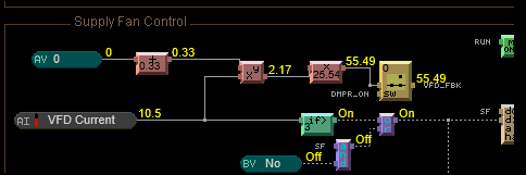 - Discussion includes a suggestion that the calculated value of 'VFD_FBK' indicates 100% fan output at a specific motor current, raising questions about the signal's application.