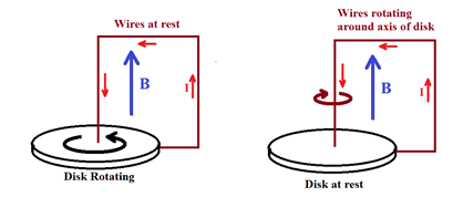 But we know that a current can be generated when the disk is not experiencing rotational forces if we rotate the external wires of the circuit instead of rotating the disk.