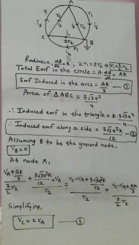 The discussion centers on applying Faraday's Law to a circular coil with an equilateral triangle inside it, where a uniform magnetic field B(t) is decreasing at a constant rate k. Participants analyze the induced electromotive force (emf) and potential difference between points A and B, emphasizing the importance of circuit layout and the non-conservative nature of induced electric fields. Key equations derived include V_{ab} = \frac{3 k a^2 \sqrt{3}}{16}, highlighting the relationship between the triangle's geometry and the induced emf. The conversation clarifies misconceptions regarding induced emf and potential difference, asserting that induced emf is path-dependent and does not rely on resistance.