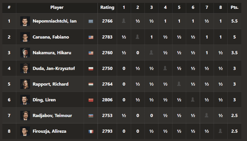 - Another participant provides the current standings after 6 rounds, listing players and their scores.