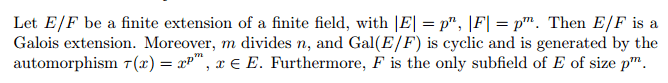 We have that $|\mathbb{F}_{p^n}|=p^n$ and $|\mathbb{F}_p(a)|=p^{p^n}$. From the above we have that $\mathbb{F}_p(α)/\mathbb{F}_{p^n} $ is Galois, $n\mid p^n$, which is true since $n=p^i$. From the theorem we also have that $\text{Gal}(\mathbb{F}_p(α)/\mathbb{F}_{p^n} )$ is cyclic and is generated by the automorphism $\tau (x)=x^{p^n}$.