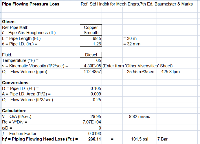 - Some participants provide specific values, such as a frictional loss of 461 kPa at a flow velocity of 7 m/s, leading to an estimated flow rate of about 337.8 lpm.
