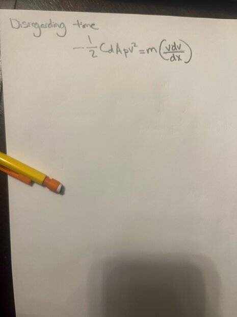 Hello! How do I find the final velocity of a car moving initially at 30.63 m/s after it has moved 45m. Over the 45 meters, It has only 1 opposing force, drag force. Ignore the force of static friction propelling it foward. However, this drag force is decreasing since this car is slowing down so this drag force is not constant throughtout the 45m. Here is the data, mass of car is 1565m, density of air is 1.3, drag coefficient of the car is 0.20, cross sectional area is 8.71 m^2.