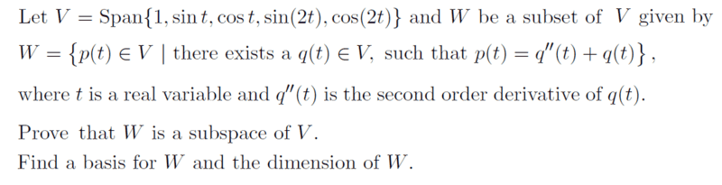 Since all elements in W are linearly independent, the basis for W is {1, sin (2t), cos (2t)}
