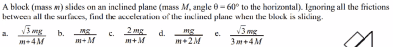 - A block (mass m) slides on an inclined plane(mass M, angle = 60˚ to the horizontal). Ignoring friction between the surfaces, find the acceleration of the inclined plane when the block is sliding.