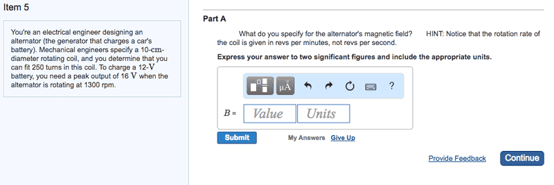 You're an electrical engineer designing an alternator (the generator that charges a car's battery). Mechanical engineers specify a 10-cm-diameter rotating coil, and you determine that you can fit 250 turns in this coil. To charge a 12-Vbattery, you need a peak output of 16 V when the alternator is rotating at 1300 rpm.