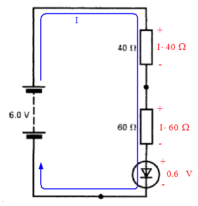 (c) 1/R = 1/30 + 1/40 → R = 20 Ω → total R = 20 + 40 = 60 Ω. I = V / R = 6 / 60 = 0.1 A. V40 = I R40 = 0.1 * 40 = 4 V.