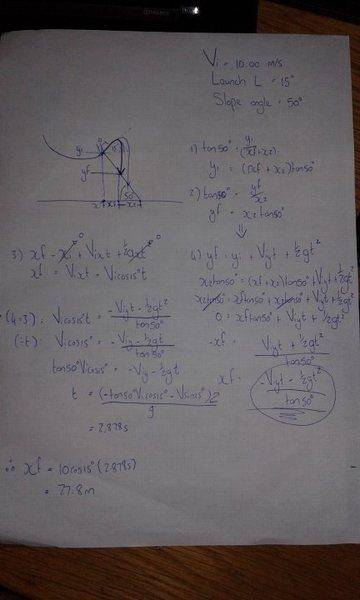 - Participants discuss the interpretation of the problem, particularly whether the distance should be measured horizontally or along the slope. There are attempts to clarify the setup and equations involved, with some participants suggesting the use of trigonometry to resolve the distance along the slope.