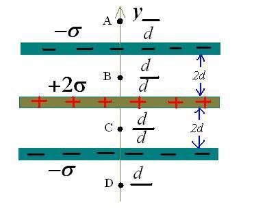The figure shows three very thin parallel planes of charge with equal separation 8 cm between them. The charge density of the middle plane is +4 nC/m2 (nC = "nano Coulomb") and that of the two outer planes is -2nC/m2. Use Gauss's law to solve the following questions. We choose positive electric field along the y-direction.
