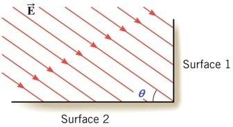 The drawing shows an edge-on view of two planar surfaces that intersect and are mutually perpendicular. Surface (1) has an area of 2.20 m², while surface (2) has an area of 3.90 m². The electric field in the drawing is uniform and has a magnitude of 200 N/C. Find the magnitude of the electric flux through surface (2) if the angle θ made between the electric field with surface (2) is 35.0°.