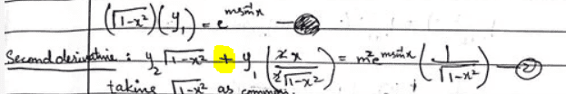 $$y^{(0)} = y = e^{m\arcsin x} \ \Rightarrow \ y^{(1)} = {m\over \sqrt{1-x^2}} \; e^{m\arcsin x} = {m\over \sqrt{1-x^2}} \; y$$and so $$