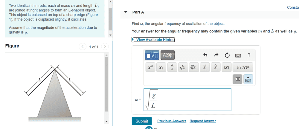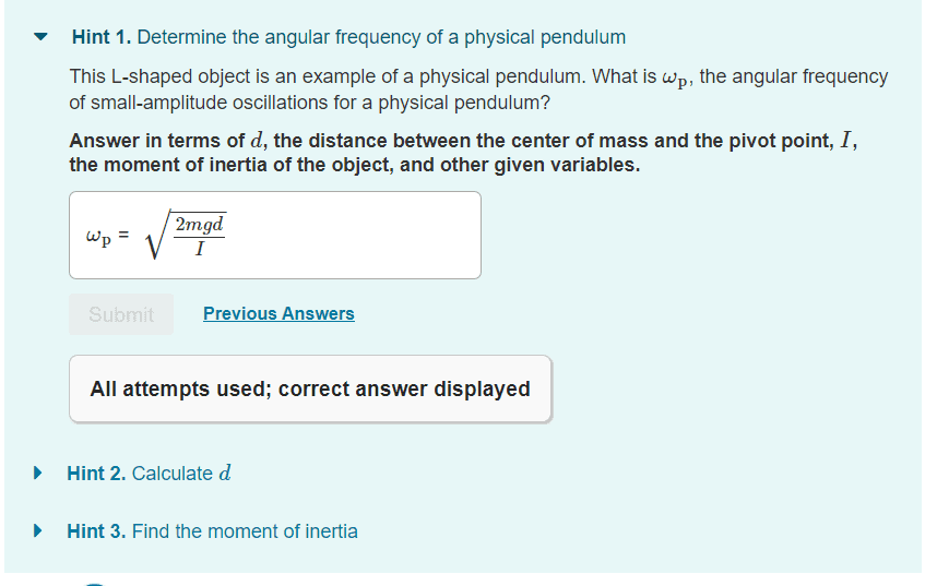 So ω=sqrt(g/L) and the hint says ω=sqrt(2mgd/I), so how is 1/L=2md/I?