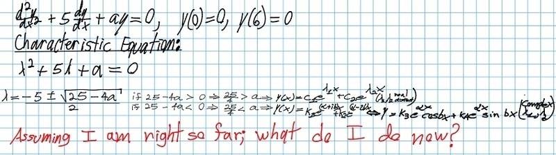 Well, you get solutions that are exponentials and exponentials times trig functions. Which seems like the better choice to satisfy y(0)=0 and y(6)=0?