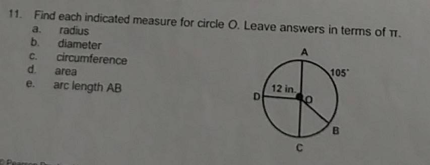 The discussion focuses on calculating the radius, circumference, area, and arc length of a circle. The values provided include a radius of 12 inches, a circumference of 75.3982 inches, and an area of 452.389 square inches. The user seeks clarification on the formula for calculating arc length, specifically how to find 105/360 of the circumference. The importance of expressing answers in terms of \(\pi\) is emphasized.