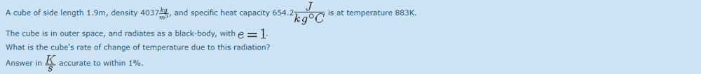 So first I found rate of heat change using the above equation, with T=883K, e=1, SA= 6*l^2=21.66