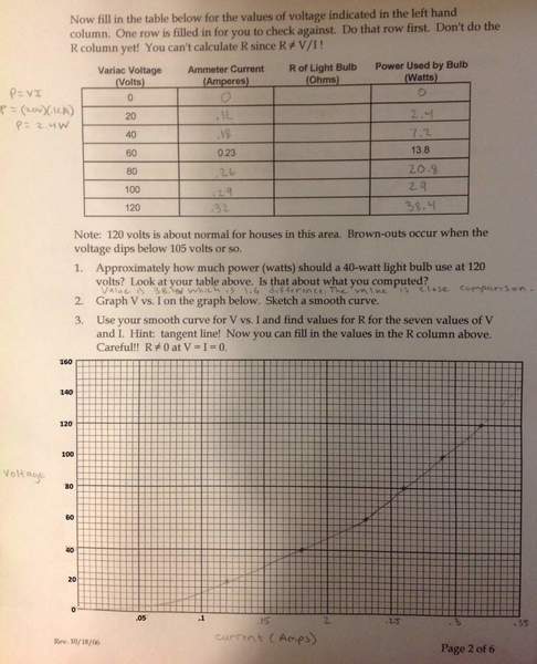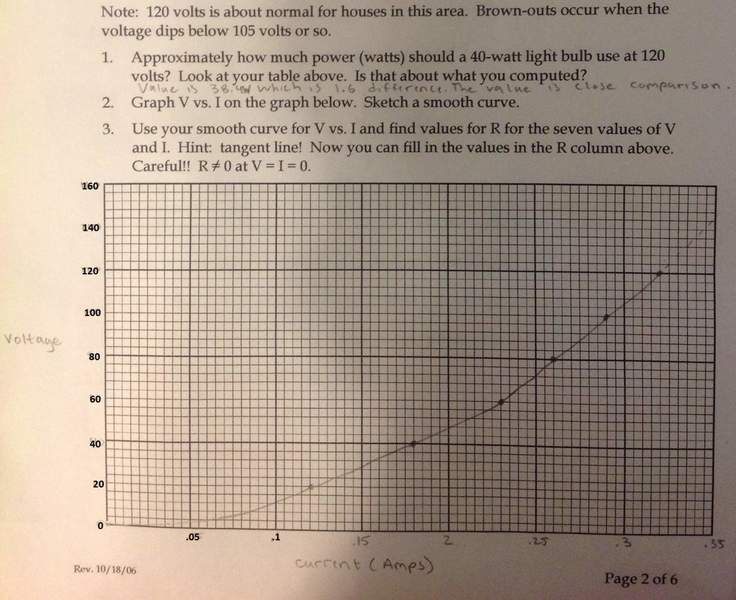 I got the slope of the tangent line and got .002Ω for each point... Doesn't seem like a correct value. Can someone tell me how to get R. It is hinted something about the tangent line. I can't use the formula R = V/I for some reason stated on the paper.