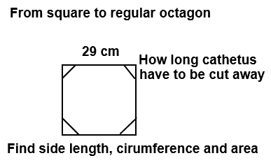 Calculate the octagonal side length, circumference, and area.