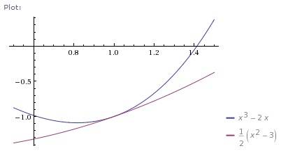 Find the point where the graphs of f(x)=x^3-2x and g(x)=0.5x^2-1.5