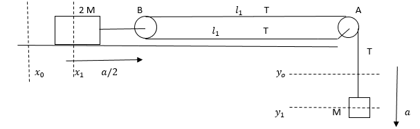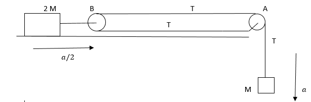 I solved this problem by assuming that the acceleration ##a## is the same on the both the masses M and 2M but then answers were wrong, but if the acceleration of the mass 2M is considered as ##a/2## then I get the right answers, but I don't how exactly acceleration is getting halved for mass 2M.