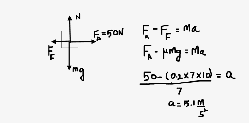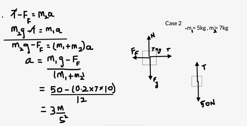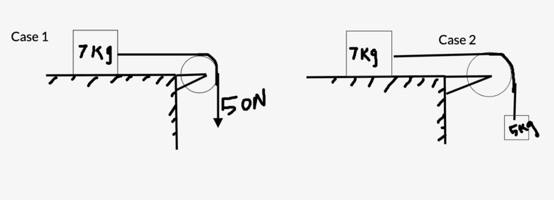 In both the cases 7 kg mass accelerates towards the right because of the 50N force. The unbalanced forces in both the cases are the force of gravity due to 5kg block and force of friction. Applying Newton's second law of motion to cases 1 and 2 yields the following results for acceleration: