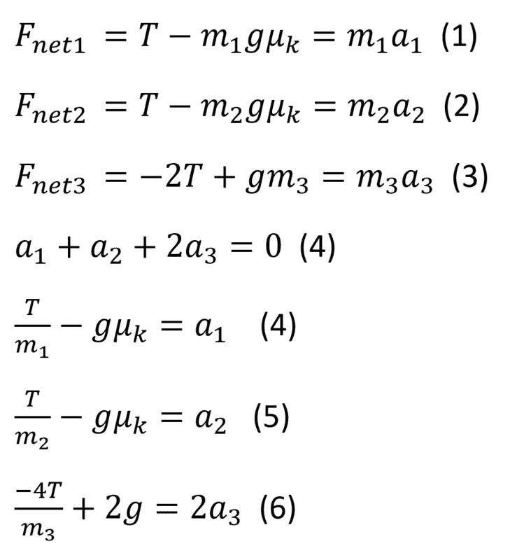 Then the forth one is the constrain equation, after that I simplified the first three equations, and I am thinking about plugging them into the forth equation and solve for T after that I get the value of each acceleration, but I have 10% scared that I am having sign wrong in one of them.