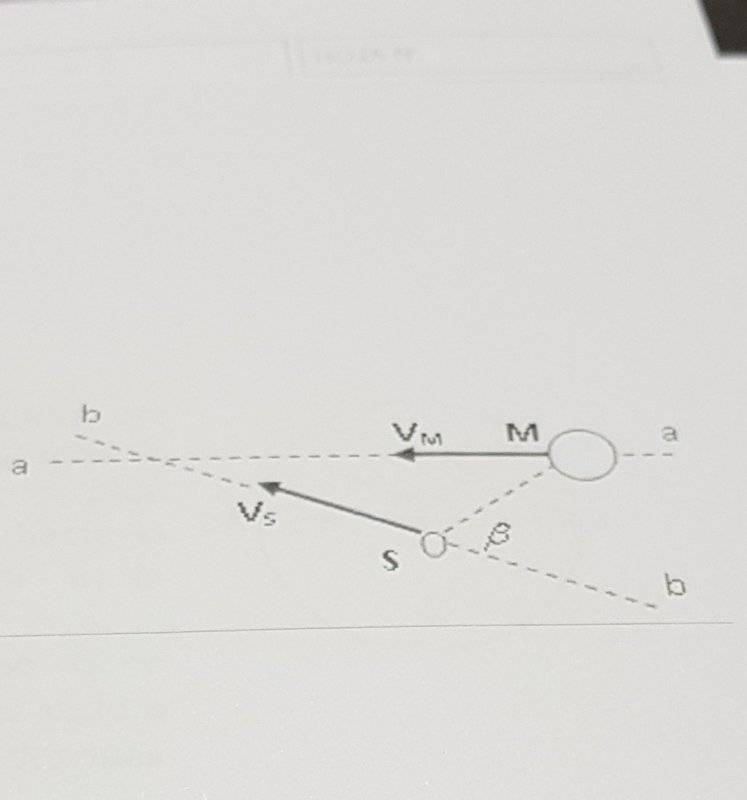 - The spaceship S approaches Mars following the trajectory ##b−b## with velocity ##19.3 km/s## with respect to the Sun. If Mars has a velocity ##24.1 km/s## along the trajectory ##a−a## with respect to the Sun and the angle between ##b-b## and ##a-a## is ##30°## determine the angle between ##SM## and ##b−b## such that a person inside the spaceship "sees" that Mars is moving towards him