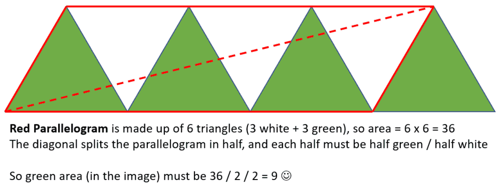 The discussion revolves around finding the area of a shaded region formed by multiple equilateral triangles and a diagonal line. Participants explore various geometric properties and calculations related to the triangles involved.