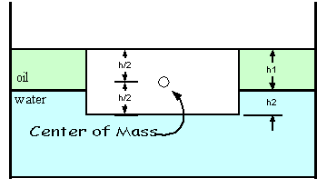 Second part (I need help here) is: A very light vegetable oil is poured slowly into the beaker, so that the oil floats on the water without mixing and until the oak plank is a few centimeters below the surface of the oil. If the density of the oil is 640 kg/m3, calculate the new position of the center of mass of the plank with respect to the water’s surface.