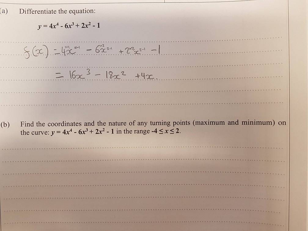 The discussion revolves around finding the coordinates and nature of turning points (maximum and minimum) for a given function, specifically focusing on the critical points derived from the first derivative. Participants are engaged in a mathematical reasoning process to solve the problem presented in a homework context.