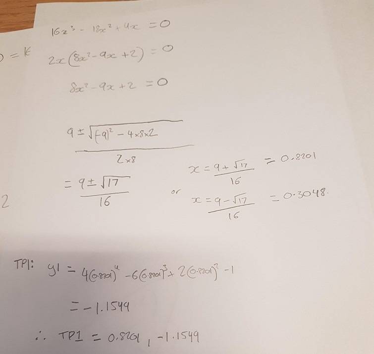 • Another participant confirms the first derivative of the function as \(y' = 16x^3 - 18x^2 + 4x\) and suggests solving \(y' = 0\) to find critical values.