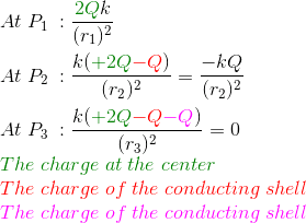 There is mention of specific charges on the conducting shells and the implications of these charges on the electric field at points P1, P2, and P3. The problem statement specifies that the shells carry a charge of -Q each, which is under discussion.