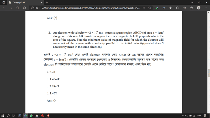 ##\vec v= 2 \times 10^6 \\ \mathrm{ms^{-1}}##Since magnetic field is perpendicular to the surface that's why I took ##\vec v \times \hat r=||v||## Wait a minute, Magnetic field is perpendicular but not velocity and velocity is parallel so ##\vec v \times \hat r=0##. But if I tried it then I would get "nothing". Did I take wrong equation? Or there's some concept which I haven't figured out?