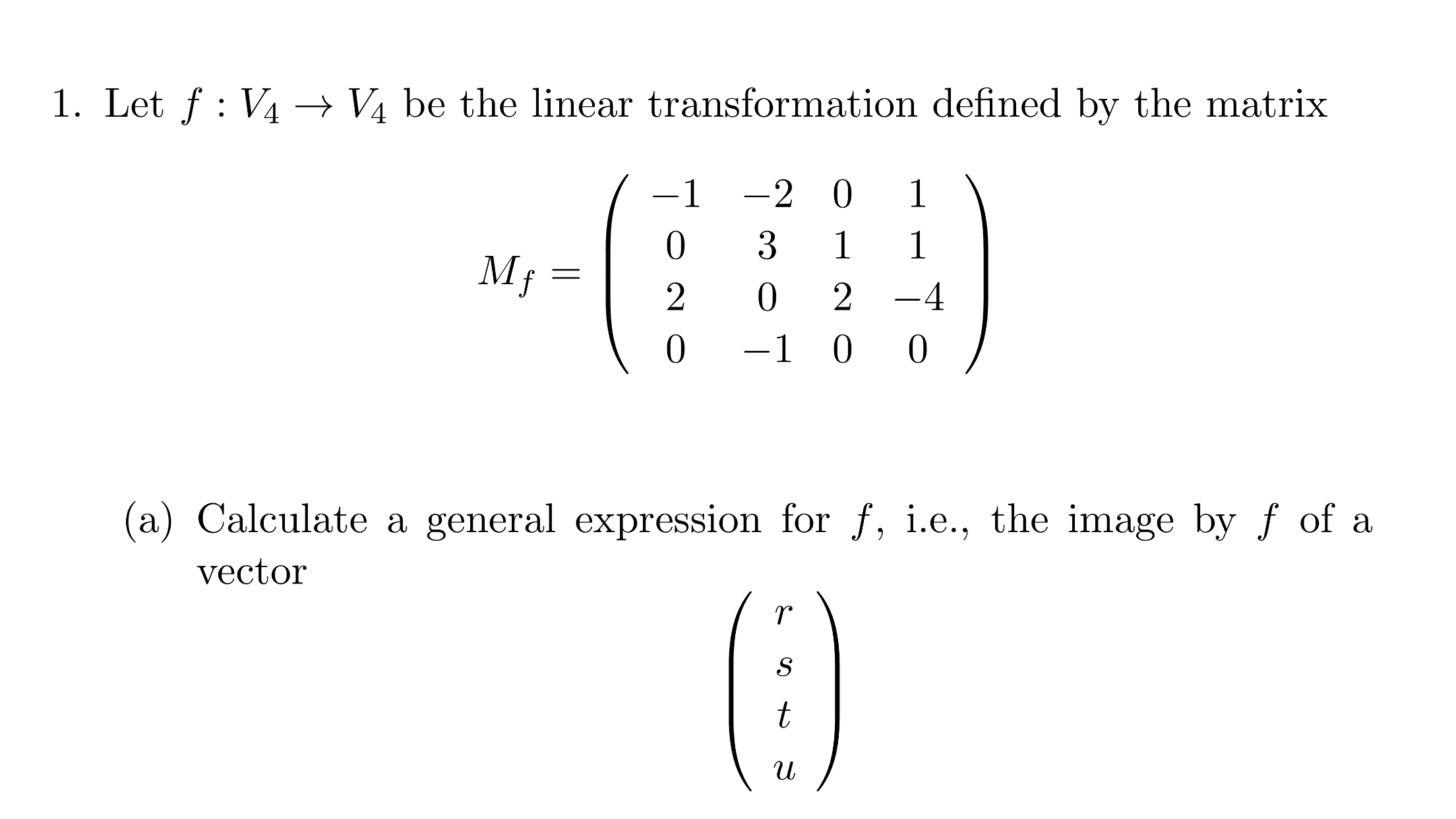 The discussion revolves around finding the general expression for a linear transformation represented by a matrix product. Participants explore how to compute the result of multiplying a given matrix by a vector, with a focus on understanding the transformation's output.