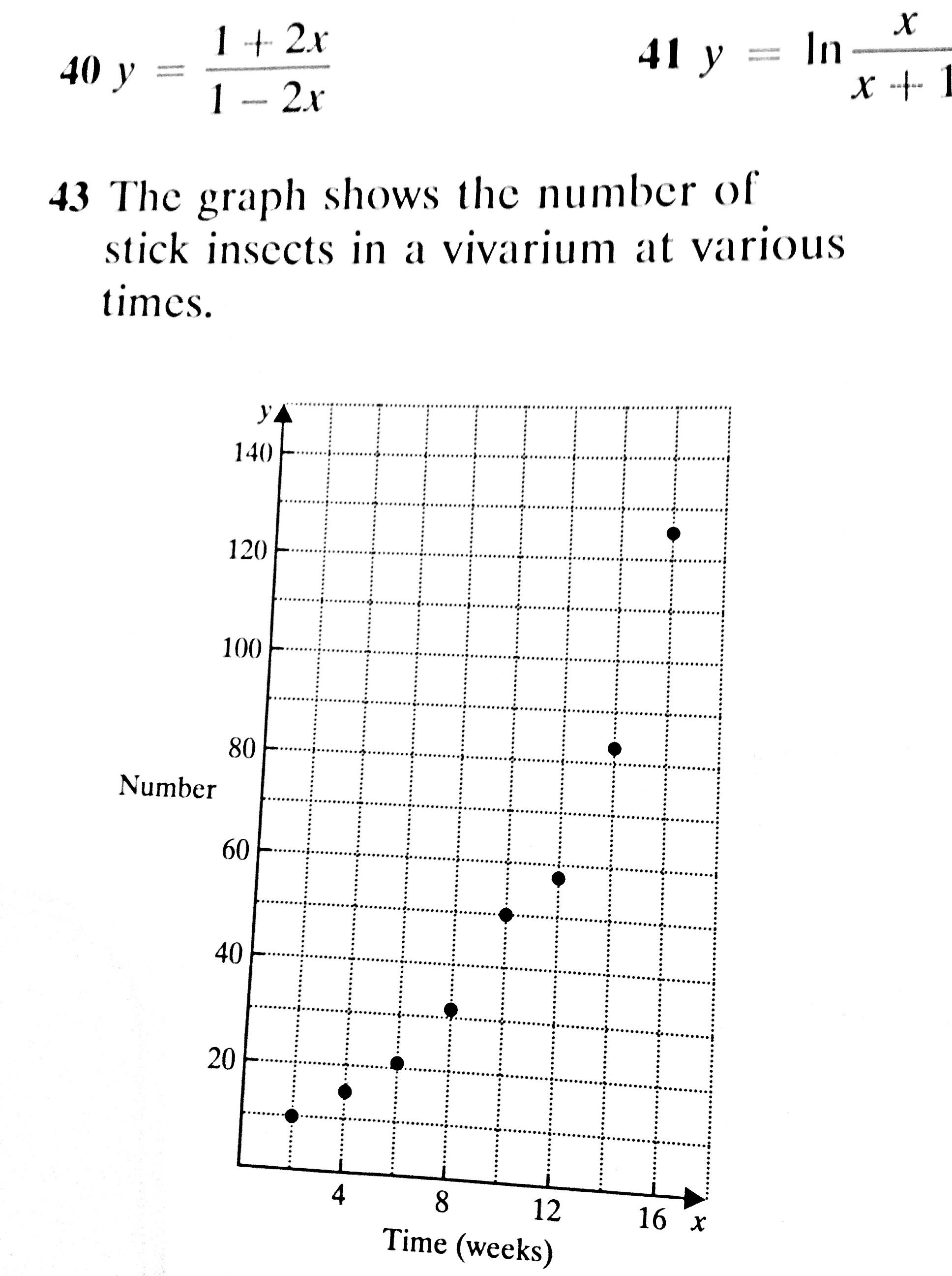 a). Find the growth factor between the numbers of stick insects in consecutive time intervals of two weeks. Hence find a relationship between ##x## (time in days) and ##y## (number of insects) that can be used as an approximate model for the data given in the graph.