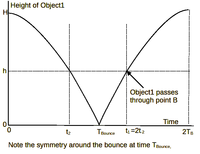 -(4-h) = sqrt(8g)t2 + (1/2)(-g)(t2)^2 to find t2 as well. Remember, we got sqrt(8g) from the velocity by which it hits the ground when falling in the y direction and it got rebounded with equal speed as it was elastic.