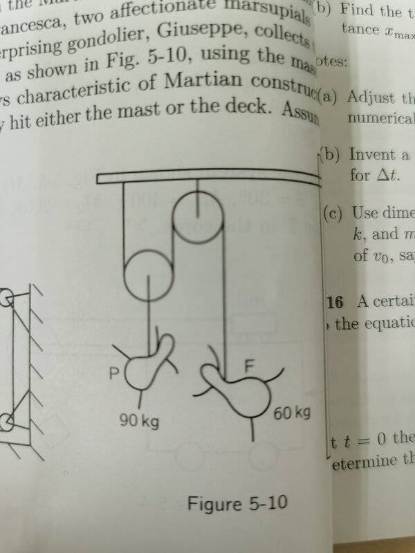 - None of the identical gondolas can support both the loads of P and F. Giuseppe rigs them up from the mass as shown in the diagram, using massless ropes and massless, frictionless pulleys. He ferries them across before they hit either the mast or the deck. Assuming P's mass is 90kg and F's mass is 60kg, how much load W does Giuseppe save?