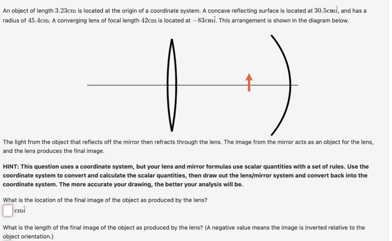 - An object of length 3.23cm is located at the origin of a coordinate system. A concave reflecting surface is located at 30.5cmi^, and has a radius of 45.4cm. A converging lens of focal length 42cm is located at −83cmi^. This arrangement is shown in the diagram below. The light from the object that reflects off the mirror then refracts through the lens. The image from the mirror acts as an object for the lens, and the lens produces the final image. HINT: This question uses a coordinate system, but your lens and mirror formulas use scalar quantities with a set of rules. Use the coordinate system to convert and calculate the scalar quantities, then draw out the lens/mirror system and convert back into the coordinate system. The more accurate your drawing, the better your analysis will be. What is the location of the final image of the object as produced by the lens? What is the length of the final image of the object as produced by the lens? (A negative value means the image is inverted relative to the object orientation.)