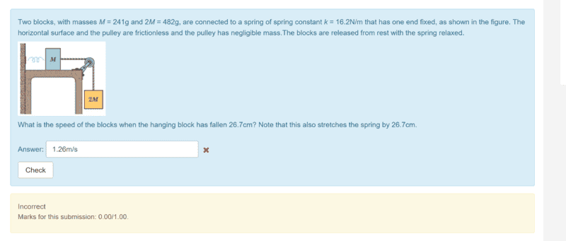Why? The KE and spring PE are both gains in energy. The only energy lost is the GPE.isukatphysics69 said:i meant to put negative spring potential energy