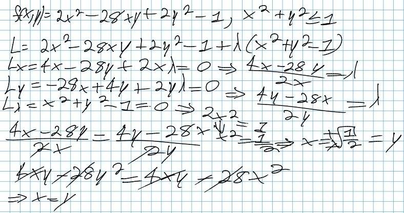 f(x,y) = 2x^2 - 28xy + 2y^2 - 1 on the disk x^2 + y^2 <= 1.