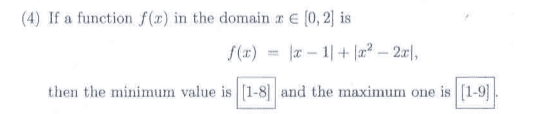 The discussion revolves around finding the minimum and maximum values of the function defined by the absolute value expressions, specifically f(x) = |x-1| + |x^2 - 2x|, within the domain [0, 2]. Participants explore the implications of differentiating the function and the conditions under which extrema can occur.