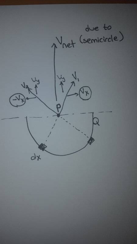 The direction of electric potential due to the semicircle is in +y direction. Because the Vx components will cancel due to the symmetry. Like in the image.